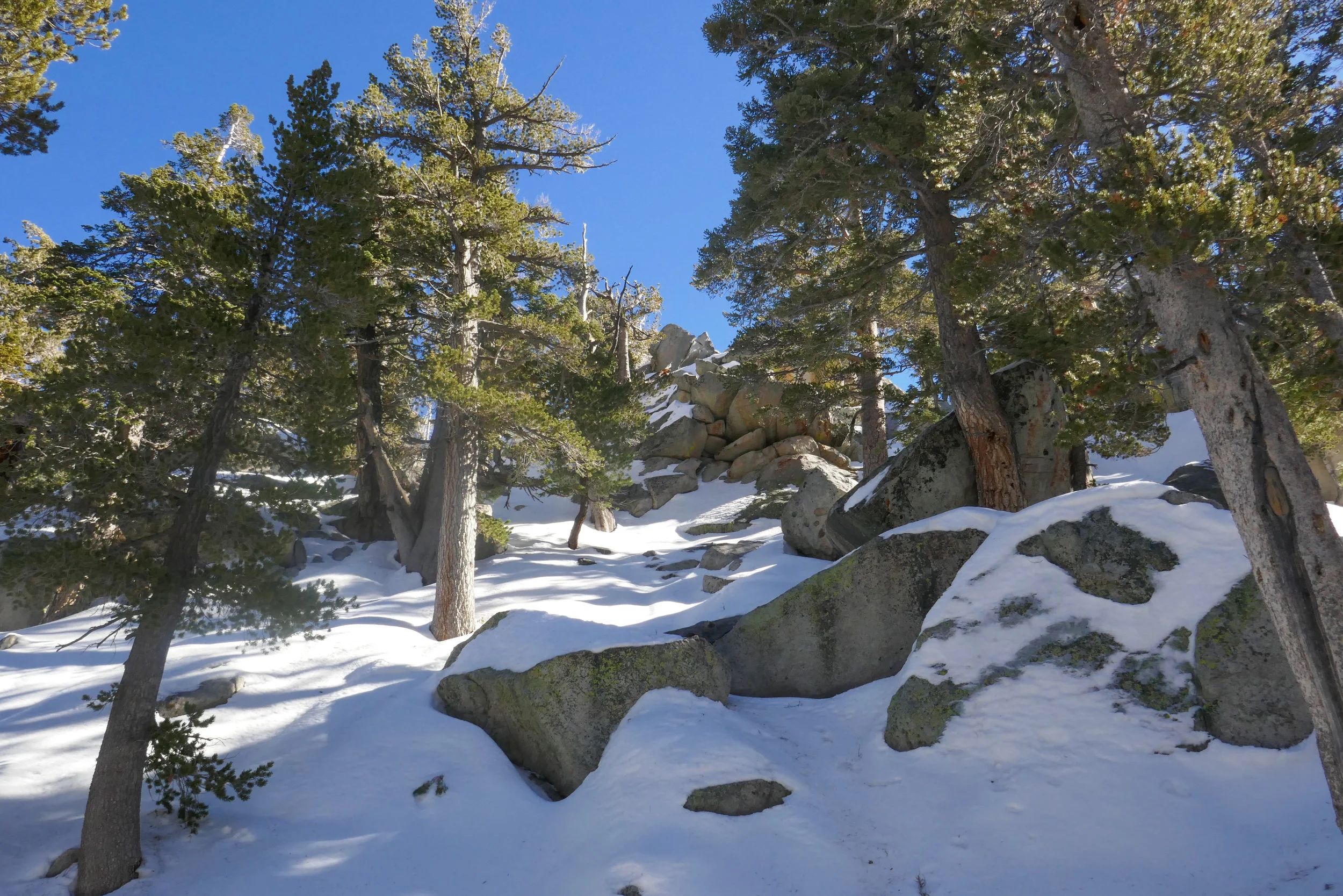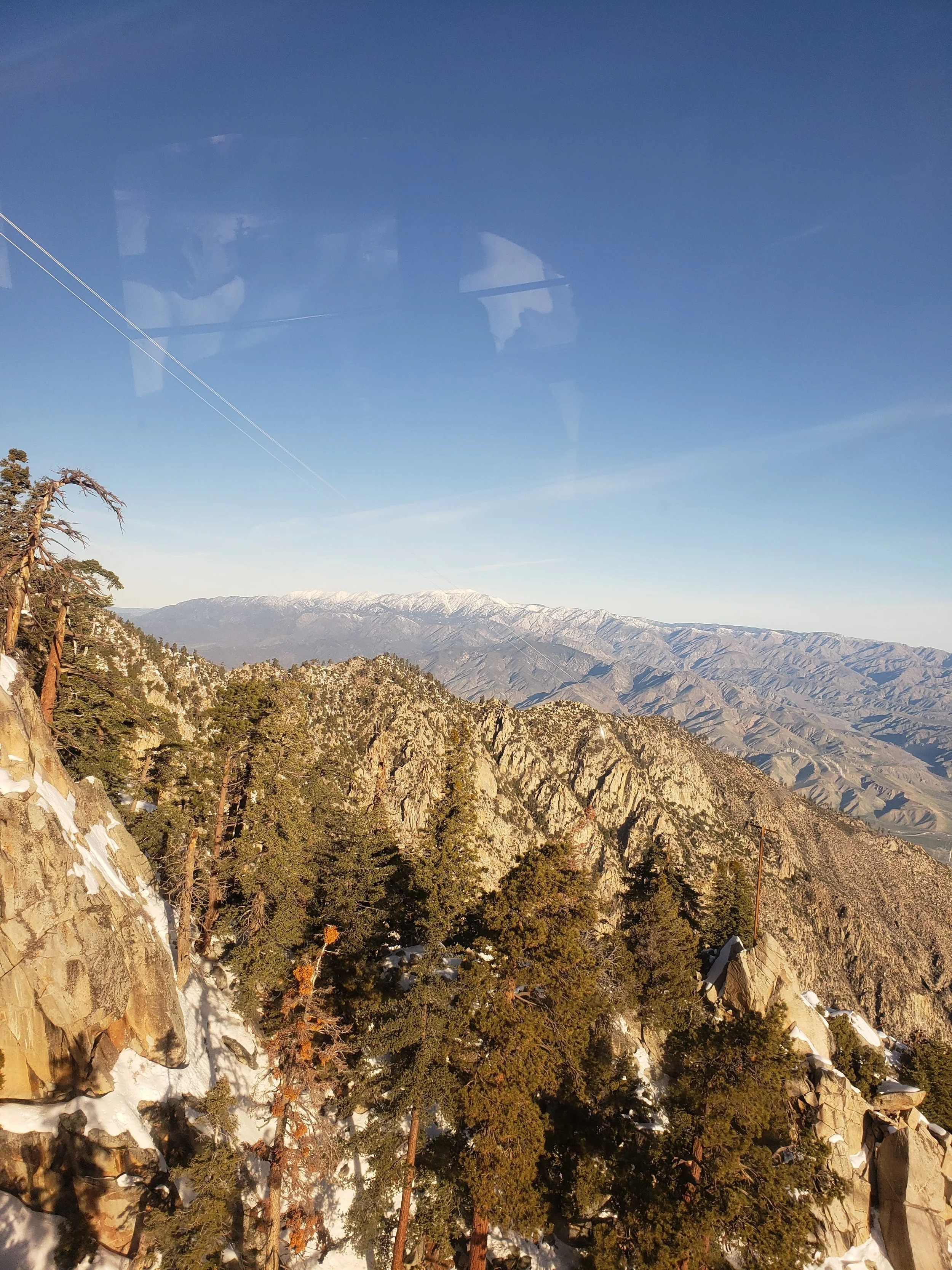 We had quite a bit of rain over the past few days and I really wanted to try snowshoeing. We had already made plans months ago to spend the weekend in Twentynine Palms, but instead of hiking in the desert like we normally would have, we decided to take the Palm Springs Aerial Tramway up to Mt. San Jacinto. We rented snowshoes from REI in Burbank and were lucky to get the last two pairs available for the upcoming weekend. Seems everyone had the same idea: Take advantage of the snow while you can. I got up at 4 am and we were on our way by 5 am. When we arrived in Palm Springs at 7 am, the parking lot was already getting filled up; families with sleds, coolers, snowshoes, etc., all gearing up for a winter play day. We got our tickets for the 8 am tram and were on our way up the mountain in no time. The tram is a unique activity to do in and of itself. I never get tired of being hoisted up a steep cliff inside a floating bubble travelling up a cable. The transition from desert floor to sub-alpine is amazing and in just 10 minutes we went from the desert floor at 2,643’ at Valley Station to 8,516’ at the top of Mountain Station. The air at the top of the tram was in the 30s. The snow was hard packed and crunchy with some ice. We headed over to the Desert View Loop to try out snowshoeing for the first time. It was actually quite easy. To me it felt a bit like an elliptical machine. The Desert View loop is a short trail with a gentle incline and five notches overlooking wonderful views. It was the perfect place to start. After we had gotten the hang of things, we headed over to Long Valley Station where we filled out a permit and continued on into the San Jacinto Wilderness with our destination being Round Valley. By this time, more people had arrived, some wearing microspikes and there were many groups of snowshoers and winter backpackers. I really enjoyed being able to “float” on top of the snow in the snowshoes. I also liked having a sturdy grip with the snowshoes’ crampon that dug its teeth into the hard packed snow for traction. I felt very secure both ascending and descending. There were a number of people on the trail today, but we were still able to enjoy some alone time. After arriving at Round Valley, we contemplated going up one more mile up to Wellman’s Divide. But instead, we changed our minds and decided to start heading back, knowing we had a cozy room waiting for us in Twentynine Palms. The weather was warming up now, and the snow was starting to get slushy. I think it was a little after 2 pm when we arrived back at Mountain Station. We had no problems getting on the next tram down and were headed out to spend the rest of the weekend relaxing and enjoying the desert. It was a wonderful day. I think I am hooked on snowshoeing and I cannot wait for the opportunity to do it again!