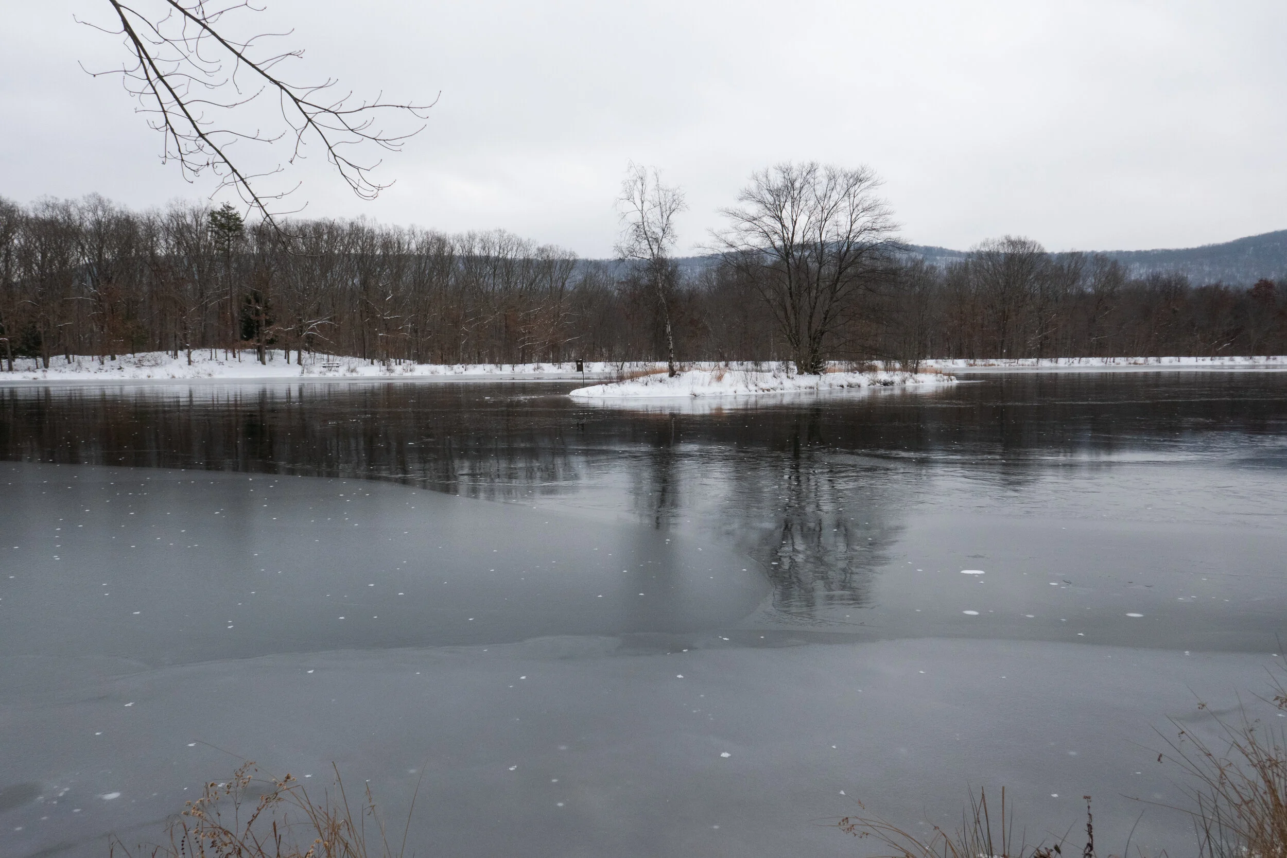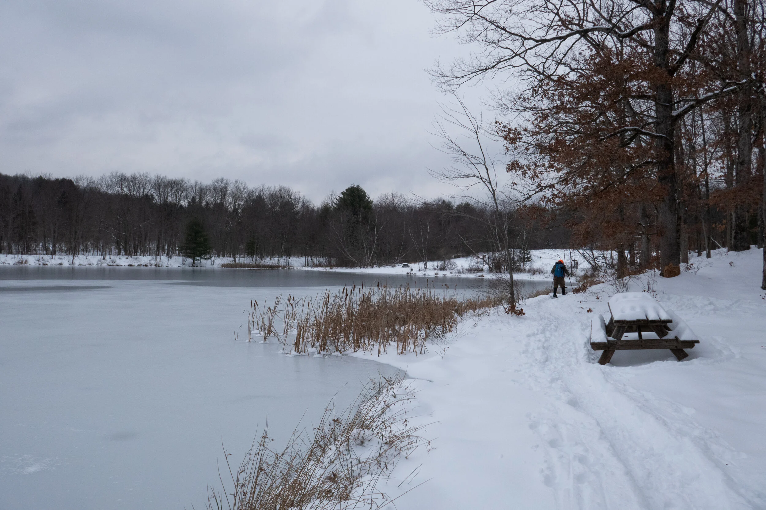 Another cold day here in the Keystone state. Today I was up and out earlier then yesterday and heading up north to the Pocono Mountains to Nescopeck State Park. The temperature this morning was in the 20s and expected to climb to about 30. The DCNR page was reporting a higher snow level at Nescopeck, and I was looking forward to snowshoeing in a bit more snow. I’m still uncertain how well they plow the roads so venturing out is a bit of an unknown adventure. We turned the car onto Honey Hole Road and it was clear. None of the turnouts were plowed, but the main lot for the lake parking was completely open. We arrived to find only one other car. I was completely baffled where everyone was? Why aren’t people out enjoying this winter wonderland? I can only conclude that where I have lived in California, snow is a novelty. Every time it would snow, Angelenos (myself included) couldn’t wait to drive up into the forests and mountain towns for outdoor recreation. Maybe winter in Pennsylvania is just an inconvenience to those who’ve lived here all their lives winter after winter. I honestly can’t say but regardless of the reason, I was not complaining about having the place pretty much to ourselves. We donned our snowshoes and headed over to Lake Frances which was just beginning to ice over. Winter is such a different world. We snowshoed around the Lakeside Trail and made our way onto the Nescopeck Trail being careful not to step onto the tracks that had been made by the cross-country skiers (outdoor winter etiquette). The snow conditions here were perfect! We had soft powder and each step was a joy to take. We trekked along until we reached the Creekside Loop Trail which crossed over Nescopeck Creek by way of a rickety, wooden bridge. The sound of the running creek and the chirp of a chickadee were all I heard in the quiet of the forest. As we continued south, I remembered we were going to end up at a trail washout that we’d encountered over the summer and would have to loop back on the Fern Trail. I made my way through the snow and along the edge of the creek enjoying every moment. The giant hemlocks heavy with snow leaned in over the partially frozen water. On our way back, we passed a couple of cross-country skiers. Again, another great place to cross-country ski with the mostly level terrain. We took our time going back and soaked in the beauty of winter. We arrived back at the frozen lake with my Garmin clocking us at about 4.8 miles. I checked the temperature just before heading home and it had reached 30 degrees by about 1:30. It was a lovely day on the eve of the winter solstice to enjoy the outdoors!